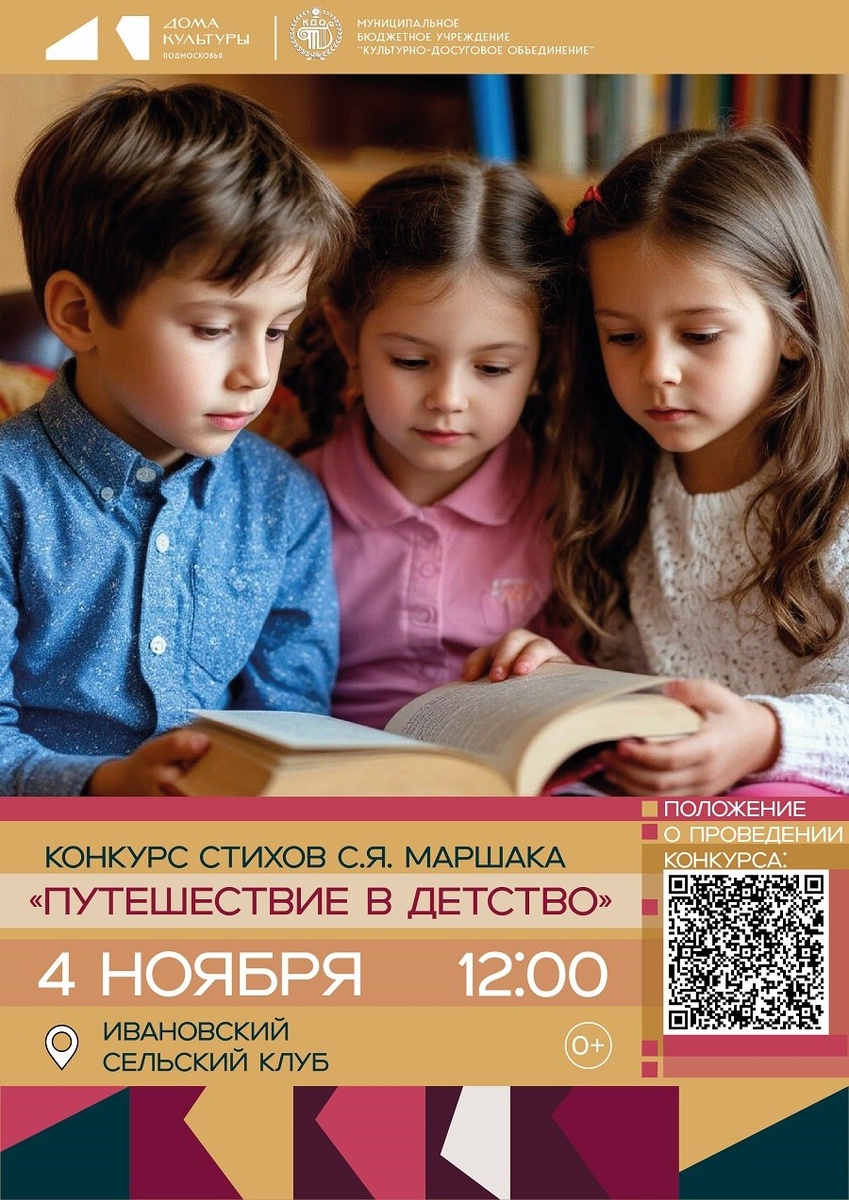 ✨ Конкурс стихов С.Я. Маршака «Путешествие в детство» Прочитать бессмертные произведения Самуила Яковлевича могут ⭕дошколята, ⭕школьники, ⭕коллективы образовательных учреждений и учреждений дополнительного образования, ⭕а также семьи. 🔍Жюри оценит индивидуальность манеры выступления, уровень исполнительского мастерства, внятность и слышимость речи, артистичность и сценическую культуру каждого конкурсанта. ✍️Прием заявок и регистрация участников ведутся по электронному адресу: vera219@yandex.ru до 1 ноября. Положение👉 https://кдо-серпухов.рф/wp-content/uploads/2025/09/Положение_конкурса_стихов_С_Я_Маршака.pdf 🏢 Ивановский сельский клуб 📍 г.о. Серпухов, д. Ивановское, ул. Советская, д.30а 📆 04.11.2025 🕒 12:00 💰 Вход свободный❗️ ⭐Поддержать канал голосом 💰 Вакансия - курьер в Серпухове ✅ Мероприятия Серпухов https://dzen.ru/id/66f01c6eb4c6fe60c9ca1608 http://vk.com/serpukhov_events http://dzen.ru/serpukhov_events
