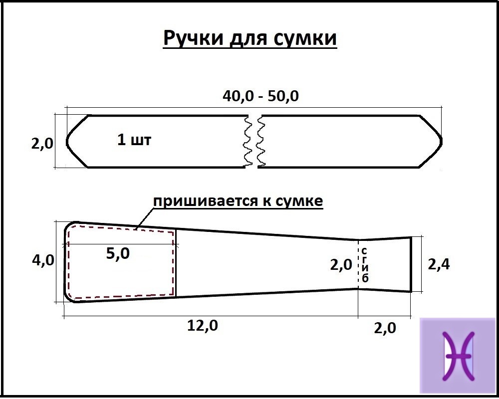 У разных моделей сумок разные по длине, ширине, виду, конструкции ручки. Я уже показывала как изготовить для сумки плоские или круглые ручки. Сегодня я хочу показать ещё одну конструкцию ручек для сумки. Именно конструкцию, так как одна ручка состоит из трех частей и её можно трансформировать: из короткой сделать более длинную. Такие ручки можно пришивать к разным сумкам. Я их делала специально для сумки тоут. На фото ниже - выкройки для ручки. Сверху на фото выкройка длинной ручки шириной 2 см. Длина зависит от модели сумки и от вашего желания. Снизу на фото - держатель для ручки. По данным выкройками выкраиваются для одной ручки - два держателя и одна длинная деталь. Так как я изготавливала ручки из натуральной кожи толщиной 1,4 мм, то я выкраивала без припусков. Если кожа тонкая или искусственная, то лучше детали для ручек выкраивать с припусками и припуски подворачивать на изнаночную сторону. Чтобы кожаные ручки не растягивались, я выкроила еще по одному комплекту деталей из водоот