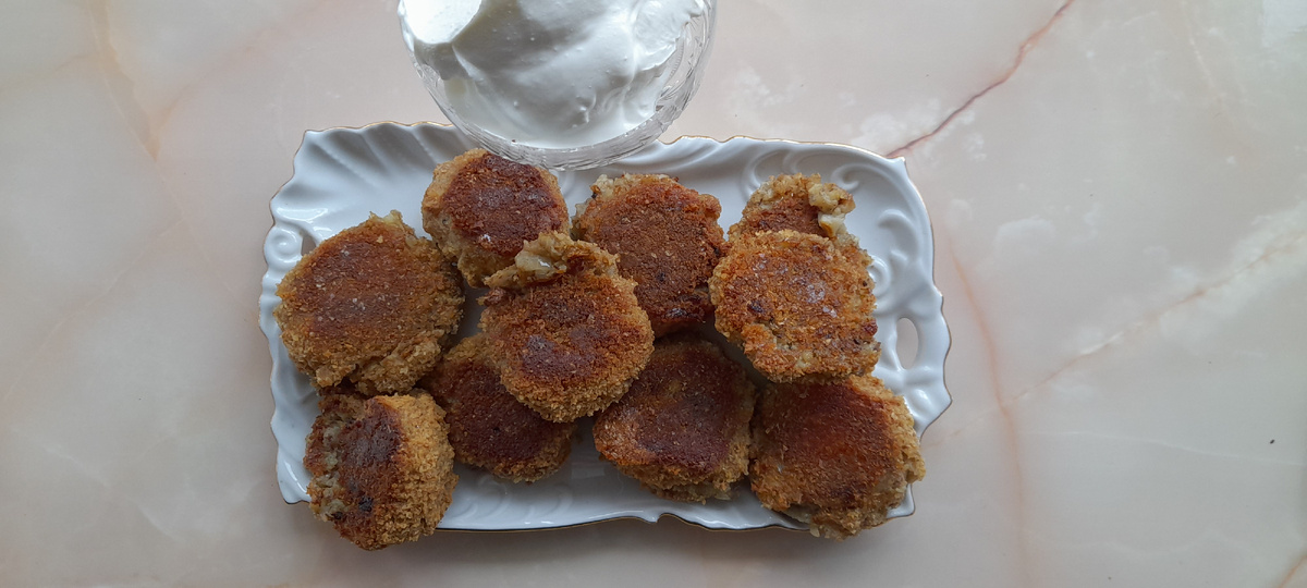 - Ставлю сковородку на огонь и выливаю туда две столовые ложки подсолнечного масла. Беру котлету, сначала опускаю в яйцо, а потом в панировочные сухари. Кладу такие котлеты на разогретое масло в сковородке. Жарю с одной стороны, затем с другой. А можно жарить такие котлеты в духовке при температуре 180 градусов где-то 30-35 минут, так проще и противень не забудьте помазать растительным маслом перед тем как класть в него котлеты. Подавать такие рыбные котлеты можно с салатом из свежих огурцов и помидор. Приятного аппетита!