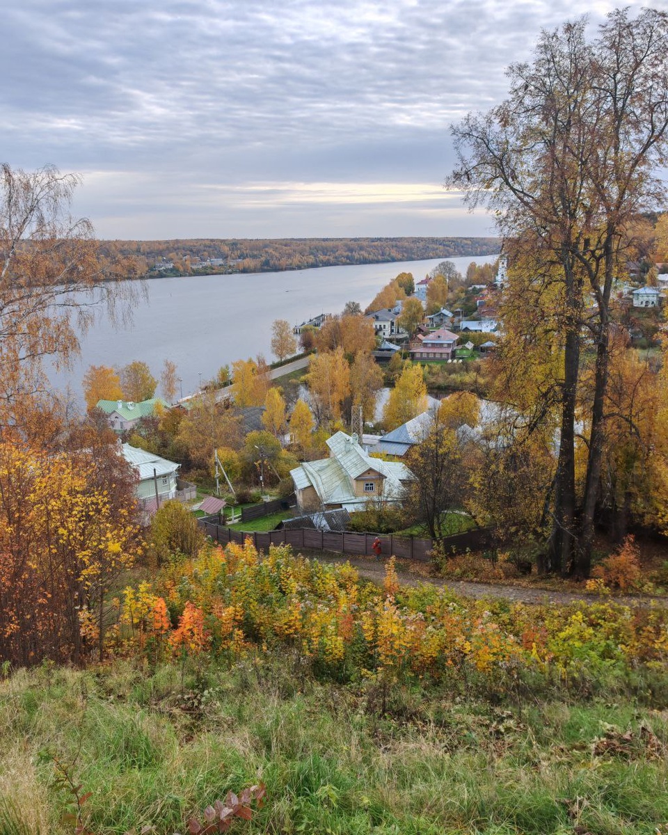 Плёс. Уютный, осенний и очень маленький. Вернулись сюда просто погулять. Очень повезло с погодой - на следущий день дождь сбил все листья. А ещё повезло переночевать в 100-летнем доме купцов Тихомировых на первой линии от Волги, где деревянные полы и потолки, а кухня совмещена с ванной комнатой. 11.10.2025 Плёс, Ивановская обл. 11.10.2025