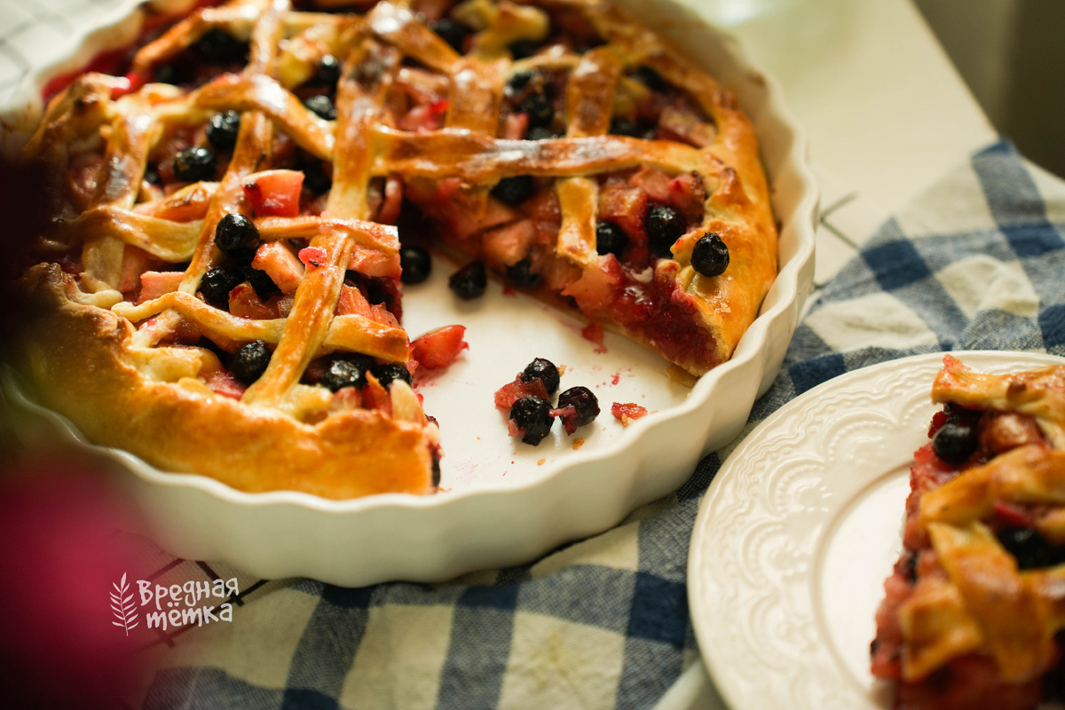 Из поздней аронии и антоновских яблок приготовила начинку, быстренько замесила своё любимое тесто и за 40 минут у меня был готов вот такой красивейший пирог! Средняя дочка устраивала с друзьями пикник во дворе, утащила угощать друзей, я только кусочек успела попробовать. Пирог все хвалили и приходили за добавкой, но я только один испекла. Тесто: Мука 450 гр Сливочное масло 180 гр Яйцо отборное 2 шт Сметана или йогурт 150 мл Сахар 2 ч.л. Соль 1 ч.л. Чтобы быстро замешать тесто, я обваливаю кусок сливочного масла в муке и натираю на крупной тёрке прямо в муку, добавляю остальные ингредиенты, замешиваю и убираю в холодильник пока готовлю начинку. Для начинки 5 крупных антоновских яблок нарезаю кубиками 1 см. На сковороде растапливаю 20 гр сливочного масла, добавляю 50 гр сахара. Можно больше если послаще любите. Высыпаю яблоки и 100 гр черноплодной рябины. Прогреваю всю массу, постоянно перемешивая, 2 минуты. Тесто раскатываю до толщины 0,7 см. Выкладываю в форму. Форма у меня керамическа