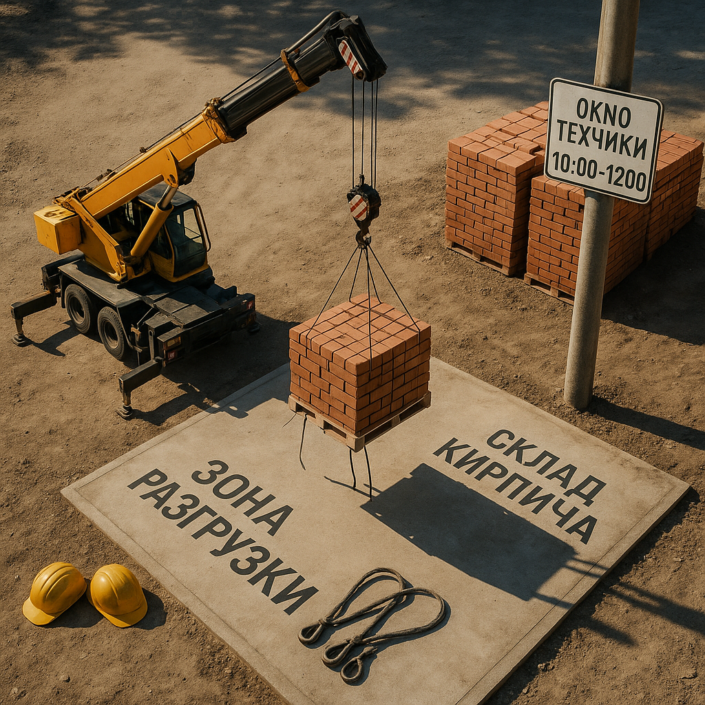 Правило: если ответ расплывчат — ставим «плавающее окно» с буфером 1–2 часа и готовим «план Б» (телефон резервной техники). Кирпич/блок Утеплитель (минвата/ПСБ/ПИР) Сухие смеси Мембраны/ленты/герметики Окна и стекло Техника_часы = (Количество_паллет × 6–8 мин) / 60 + Буфер (0,3–0,5 ч)