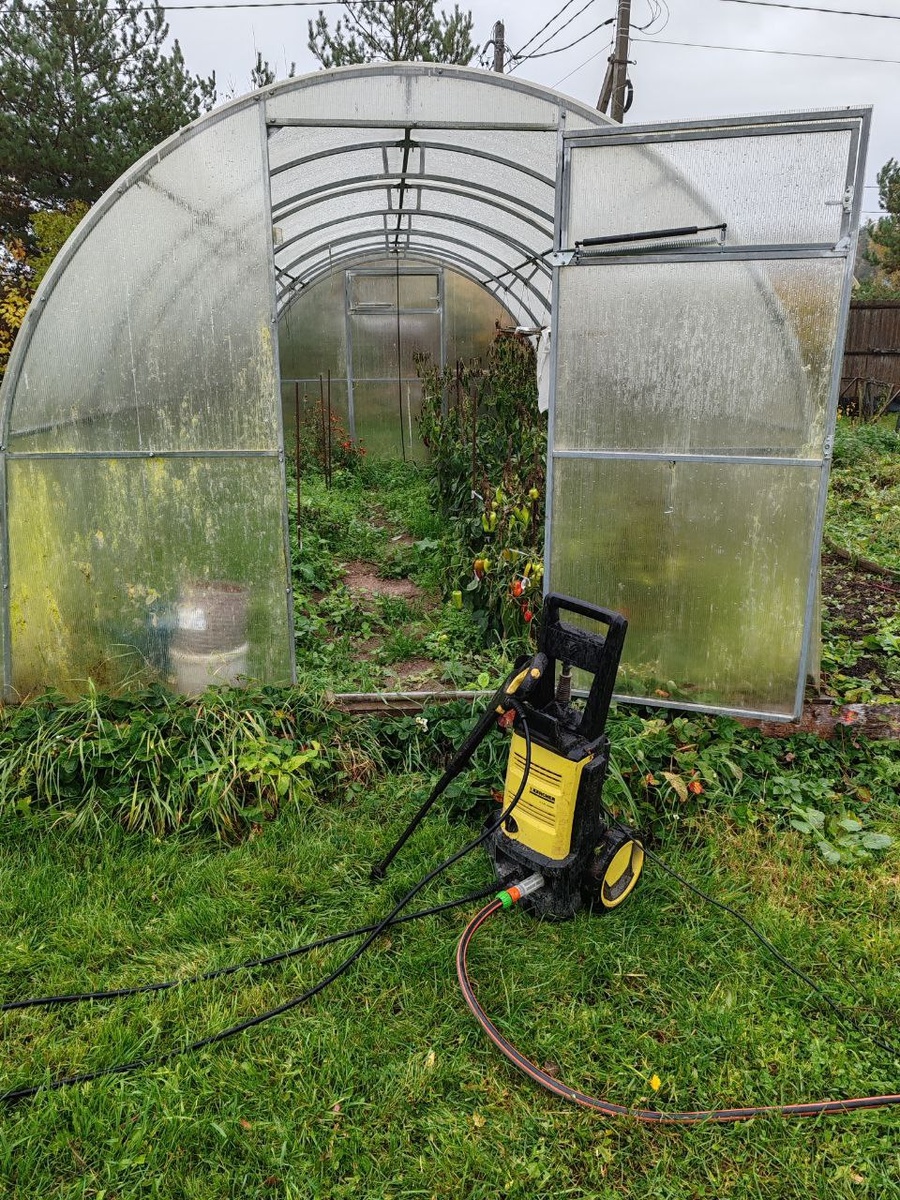 Работа дня. Пришло время законсервировать летний водопровод, но прежде нужно было провести первый этап подготовки теплиц к новому сезону. Этап 1. Чистка (мойка) с помощью керхера теплиц. Второй этап это будет обработка, лучше использовать медный купорос, так как после железного образуется желтоватый налёт. Продувка и консервация летнего водопровода. Не забывайте, что керхер, шланги хранить в отапливаемом помещении! ☝️