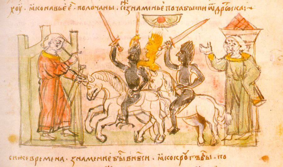 Новгородская первая летопись младшего извода: "Наиде рана на Полочаны, яко некако бяше ходити по улицамъ, яко мнете вои множество, а конем копыта видети; да аще кто из избе вылазяше, напрасно убиенъ бываше невидемо" Для сравнения Круг Земной (свод скандинавских саг): "В ночь на воскресенье после пасхальной недели в Конунгхелле по улицам всего города прон