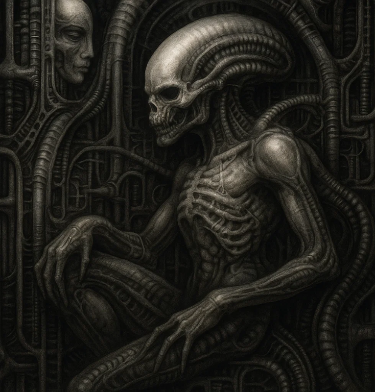 Машина дышит. Металл блестит, как кожа. Внутри — пульс, но это не жизнь, а её имитация. Так рождается один из самых пронзительных образов в истории фантастики — чужой, существо, вышедшее из кошмаров и кисти Ганса Руди Гигера. Его эстетика не просто изменила жанр хоррора и научной фантастики — она навсегда стерла грань между живым и искусственным, между телом и механизмом. 👽 В 1979 году, когда Alien впервые появился на экране, зрители ощутили не только страх, но и странное восхищение. Образ чужого, выросший из картины Necronom IV, оказался не просто монстром — он стал символом новой философии: технология может стать плотью. Гигер соединил в своих биомеханических видениях то, что раньше считалось несовместимым: органику и металл, желание и ужас, эротику и смерть. Гигер называл свой стиль «биомеханикой» — соединением анатомии и индустриальной структуры. Его существа словно сотканы из мышц и труб, из костей и шестерёнок, из живой плоти, пронизанной бездушным металлом. В этом мире нет гра