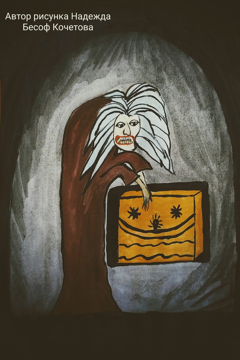 Рамир обошел кровать, боясь заглянуть за балдахин. Немного помешкав, он все же отодвинул его. На кровати лежала худощавая старуха в коричневом обветшалом балахоне, изогнутые желтые пальцы с длинными когтями, большой горбатый нос, огромный рот с тонкими губами, из-под которых торчали длинные клыки. Рамир не мог понять, жива она или нет, и наклонился над ней, чтобы послушать дыхание. В этот момент бабка схватила его своими костлявыми руками и потянула к себе с неимоверной силой, так что цыган не мог пошевелиться. От страха перехватило дыхание, он не мог даже закричать. Старуха впилась клыками в его шею и, причмокивая, стала высасывать кровь. Рамир был словно парализован, он ничего не мог сделать, лишь открывал рот, вытаращив обезумевшие от ужаса глаза.
