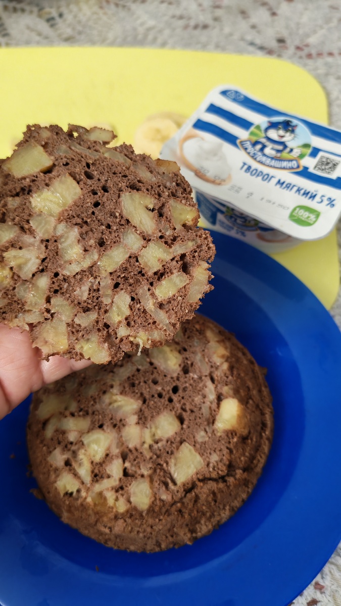 Торт на перекус. В микроволновке за 3 минуты. Не верите? Попробуйте. Яйцо 1шт, кефир1% 30гр, Мука кокосовая 1 ч. л Клетчатка-какао 1ч.л Соль, разрыхлитель, 0,5 банана. Всё перемешать и в микроволновку. Крем: 0,5 банана и мягкий творог 5% 100гр. Бисквит разрезать на 3части и промазать кремом, разложить банан Вес 240гр. Сахар не добавляла, мне хватает сладости банана. Приятного аппетита