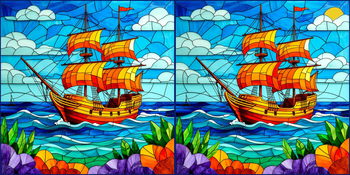 Сегодня приглашаю вас в небольшое морское путешествие и насладиться видом замечательного витражного кораблика. А заодно потренировать внимание и найти 5 отличий между картинками. Добро пожаловать на мой канал! Каждый день я предлагаю Вам новые логические задачки, чтобы немного расслабиться и переключиться. Думайте, решайте, разгадывайте, пишите ответы в комментариях. * * * Поиск отличий на двух почти одинаковых картинках — это увлекательное занятие, которое способствует развитию внимания, наблюдательности, концентрации и усидчивости. К тому же - это просто весело и интересно! Наслаждайтесь! * * * Итак, попробуйте найти 5 отличий между этими картинками. Нажмите на картинку, чтобы она открылась в большом размере. А ответы, как всегда, можно подсмотреть в галерее ➡ И те же самые картинки в вертикальном формате для тех, кто смотрит в телефоне 😏📱 Все отличия получилось отыскать? Пишите ответы в комментариях 👇🏻👇🏻👇🏻 И заглядывайте в другие головоломки: * * * Все иллюстрации созданы ли