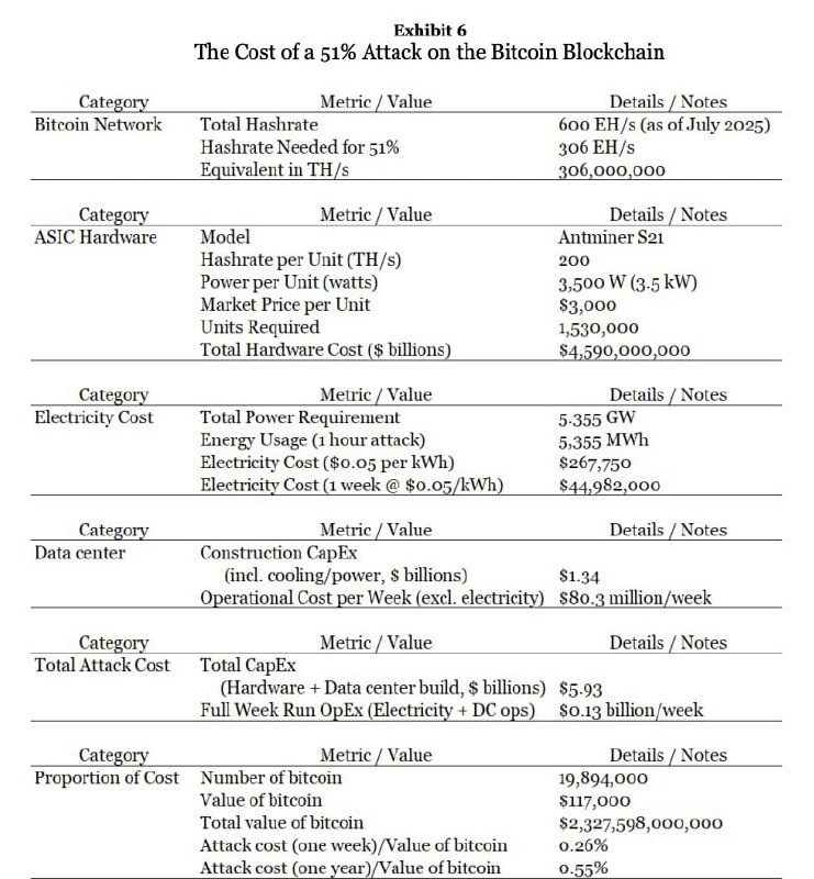 🔒 Атака 51% на Bitcoin — во сколько это обойдётся? По оценке профессора финансов из Университета Дьюка Кэмпбелла Харви (данные Bloomberg), теоретическая стоимость захвата контрольного пакета хешрейта Bitcoin на июль 2025 года — примерно $6 млрд. Речь о так называемой «атаке 51%», когда злоумышленники получают достаточную вычислительную мощь, чтобы блокировать или отменять транзакции и вносить изменения в цепочку блоков. 🔢 Разбивка затрат (по расчётам автора): ≈ $4,6 млрд — покупка майнингового оборудования; ≈ $1,4 млрд — строительство и запуск дата-центров; ≈ $130 млн/неделю — операционные расходы на электроэнергию. 🧾 Вывод исследователя: такой сценарий «более реален, чем принято думать» — но он требует колоссальных инвестиций и логистики. 🤔 Мнение рынка: многие эксперты считают экономическую целесообразность атаки сомнительной — масштабные затраты и технические сложности делают практическую реализацию маловероятной. При этом вычислительная защита сети и рыночные механизмы о