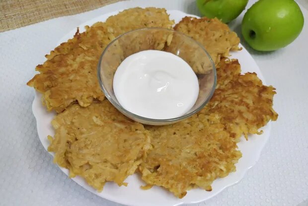 Яблоко 500 г Куриное яйцо 1 штука Сахар 2 столовые ложки Корица ½ чайные ложки Пшеничная мука 3 столовые ложки Растительное масло 20 мл Сметана по вкусу 1.Подготовить яблоки, выбрать кислый сорт. 2.Очистить от кожуры. 3.Натереть на крупной терке. 4. Добавить 1 яйцо. 5.Добавить сахар. 6.Добавить корицу. 7.Добавить муку. 8.Выложить ложкой оладьи на сковороду с разогретым растительным маслом. 9.Обжаривать с двух сторон до золотистой корочки. 10.Подавать горячими, добавив сметану по вкусу. Любите читать Дзен «Еды»? Расскажите свое мнение о материале в комментариях и ставьте свои лайки!