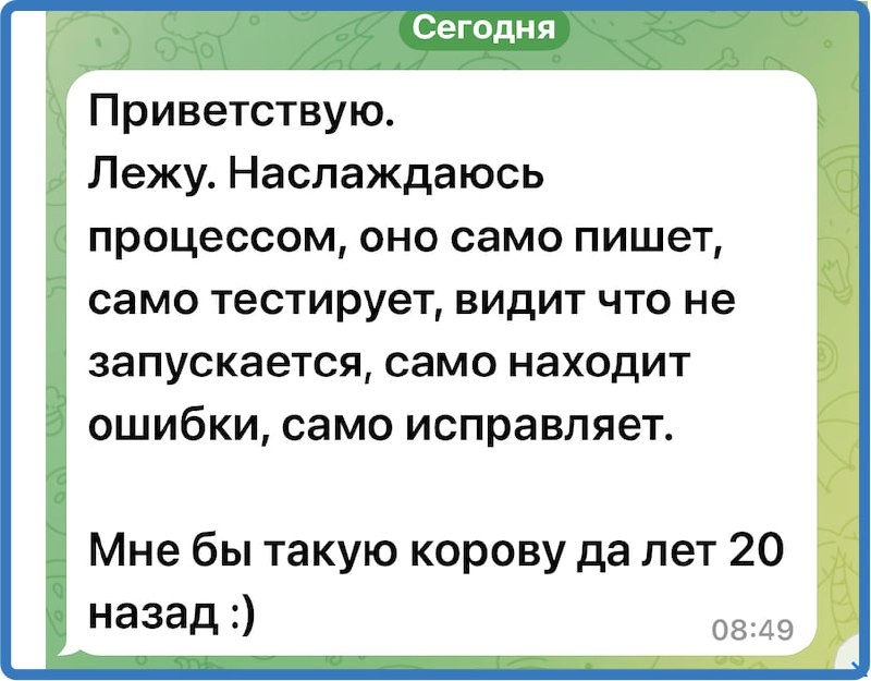 Мне пишет могучий программист, 20 лет стажа на PHP. Использует Cline. Я видел его работы - очень достойно. Вот будущее разработки, лет через 5. Попросил его записать видео, как он программирует на нем. Русский ИТ бизнес