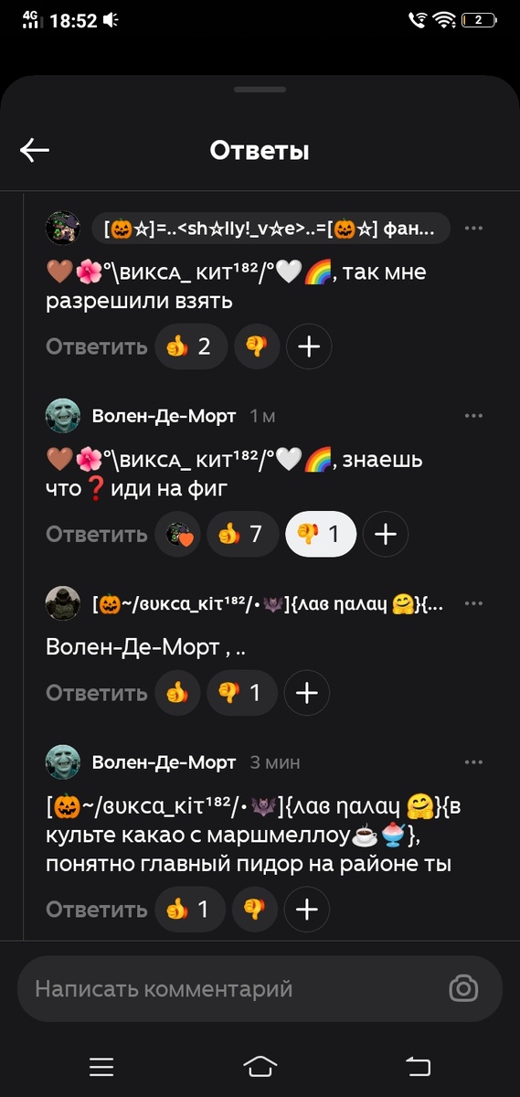 [.•°🚬☆~Автор~☆💔°•.]:-Волен-Де-Морт... Я все конечно понимаю... Ну да я пидораска и что. Посмотри на себя зеркало🤭 Негр еб@ный <3...