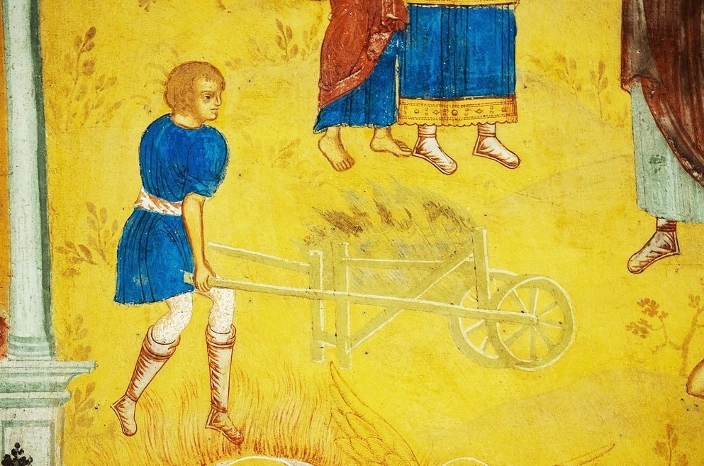 Мальчик с тачкой. Фреска церкви Иоанна Предтечи. Ярославль, XVII в.