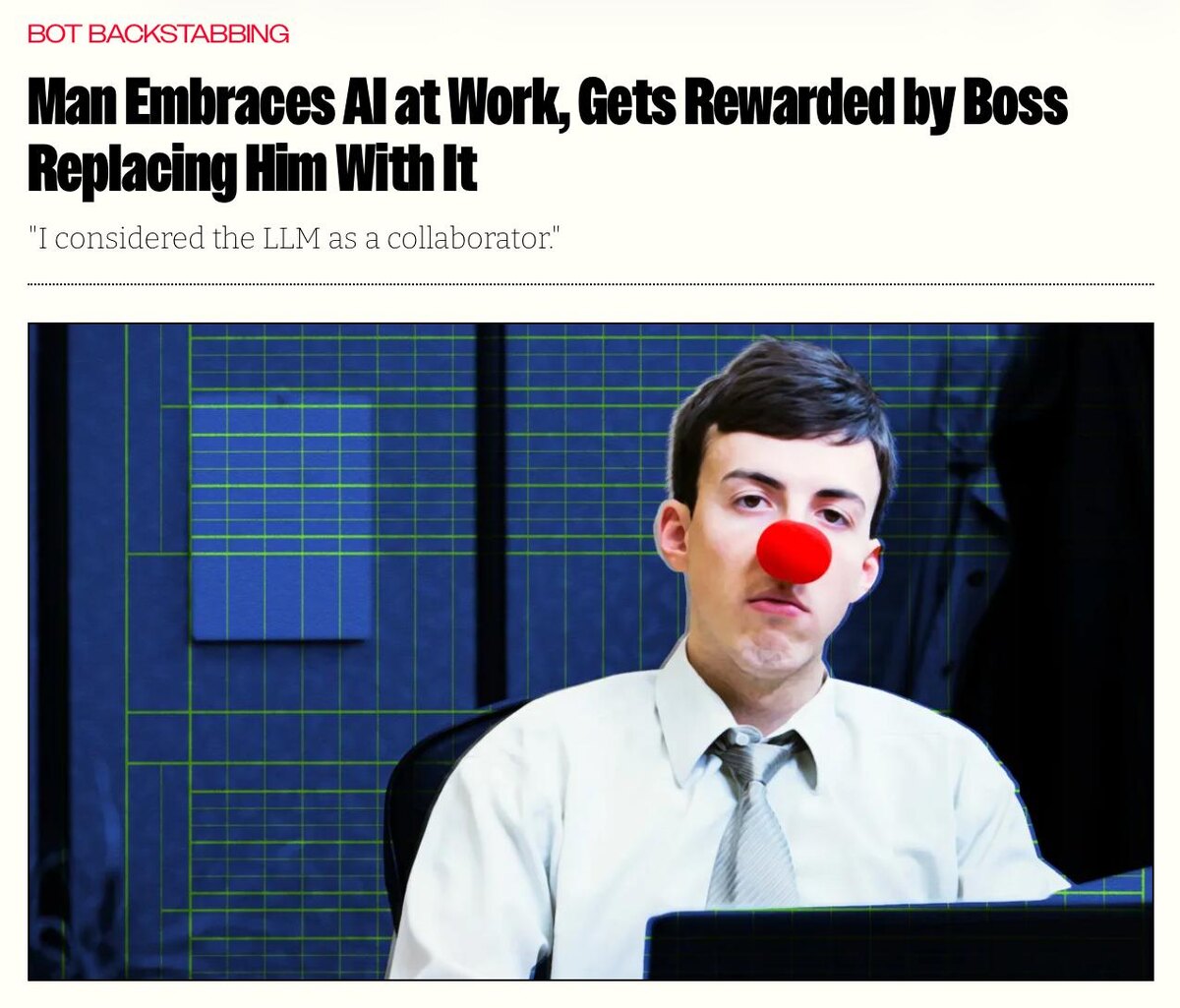 В США айтишника попросили внедрить ИИ в проект, чтобы облегчить работу, а когда он научил ИИ выполнять свои рабочие обязанности — его уволили. Кевин проработал в компании 17 лет, но однажды начальник попросил его интегрировать нейросеть, чтобы она могла забирать часть обязанностей сотрудников и облегчить им жизнь. Парень настолько хорошо справился, что предложенный вариант устроил босса, и тот заменил им больше 10 сотрудников, включая самого Кевина. Пу-пу-пу... Источник: t.me/datais