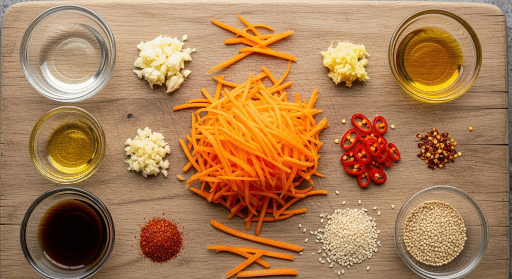 Для приготовления понадобятся: свежая морковь, чеснок, имбирь, соль, сахар, уксус, растительное и кунжутное масло, кунжут, красный перец и зеленый лук. Для особого вкуса можно добавить корейские специи: кимчи-пудру и красный перец флейкс.