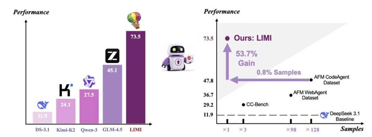 📄 LIMI: Less Is More for Agencies New research shows that when it comes to agency AI, quality beats quantity! 💡 Key Takeaways: - 78 carefully curated demos scored 73.5% on AgencyBench – outshining models trained on 10k examples! 📈 - Results are higher than SOTA: Kimi-K2 (24.1%), DeepSeek (11.9%), Qwen3 (27.5%), GLM-4.5 (45.1%). 🤯 - Introducing the Agency Efficiency principle: AI autonomy comes from strategic data selection, not sheer volume! 🔍 Check it out: https://github.com/GAIR-NLP/LIMI
