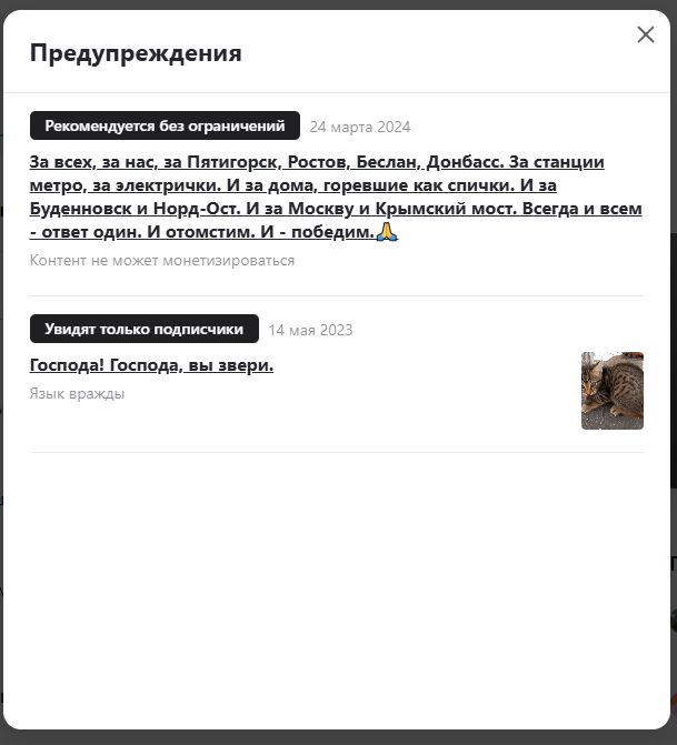 (Кстати, второе предупреждение - за статью, опубликованную более двух лет назад - получено недавно. Так, что неизвестно, что не понравится ИИ в следующий раз. Может какая-нибудь совсем древняя публикация.)