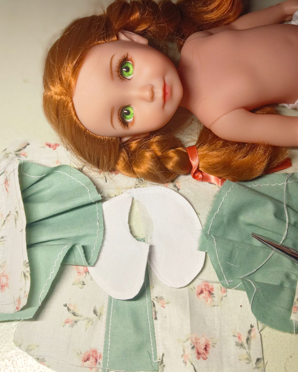 Всем привет! Дело было вечером, делать было много что)) Сегодня сказ будет о том, как одна капризная куколка осталась без нового платья . Итак решила поменять фабричное платье Рыжику, изначально я уже пыталась из него сотворить новое платье, но оно не зашло, ни мне ни ей. И вот вечером начала раскрой совершенно нового платья. Ждёт такая, улыбается) Продолжаю работать над платьем для Рыжули, и это становится настоящим приключением! Второе платье, которое я шью для нее, уже обретает очертания, но вот беда — воланы, которые я так старательно добавляла, выглядят не так, как я себе представляла. Подумав немного, решила внести немного дополнительного декора и пришила ряд кружева, надеясь, что оно добавит объема и задекорирует ряд. Но, увы, даже это не спасло ситуацию. Похоже, мне придётся полностью переделывать подол. Разочарование? Да, но я знаю: в творчестве такие моменты — это лишь ступеньки на пути к совершенству. Параллельно сохнут тапочки для куклы. Я использовала колодку для
