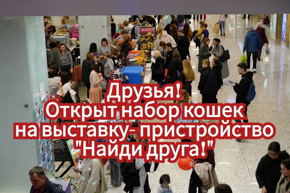 Москва. Московская область. Организатор выставок «Найди друга». Центр защиты животных АНО «ГБР.Зоозащита» открывает набор кошек и котят на выставку-пристройство «Найди друга». 🔷Выставка будет проходить 25 октября, с 12 до 20 часов, в ТЦ Водный по адресу: Москва, Головинское ш. д.5 к.1 3 минуты от метро🚇 Водный стадион ❗Заявки принимаются до 15 октября включительно. Набор может быть окончен заранее! Не верно заполненные заявки рассмотрены не будут! Ответ о рассмотрении заявки ожидайте не ранее 17 октября. Если ответ не поступил, значит заявка не одобрена. Кураторы привозят свои клетки для кошек! Количество мест ограничено! Заявки принимаются на почту gbr.findfriend@ya.ru. 1 животное - 1 письмо В теме письма: Выставка 25 октября кошка «кличка» В самом письме: 1. ФИО, телефон куратора (телефон должен быть с приложением телеграмм и открытым номером для добавления в чат выставки) 2. Кличка кошки, возраст (не дата рождения) 3.Количество клеток для всех кошек которых планируете везти на в