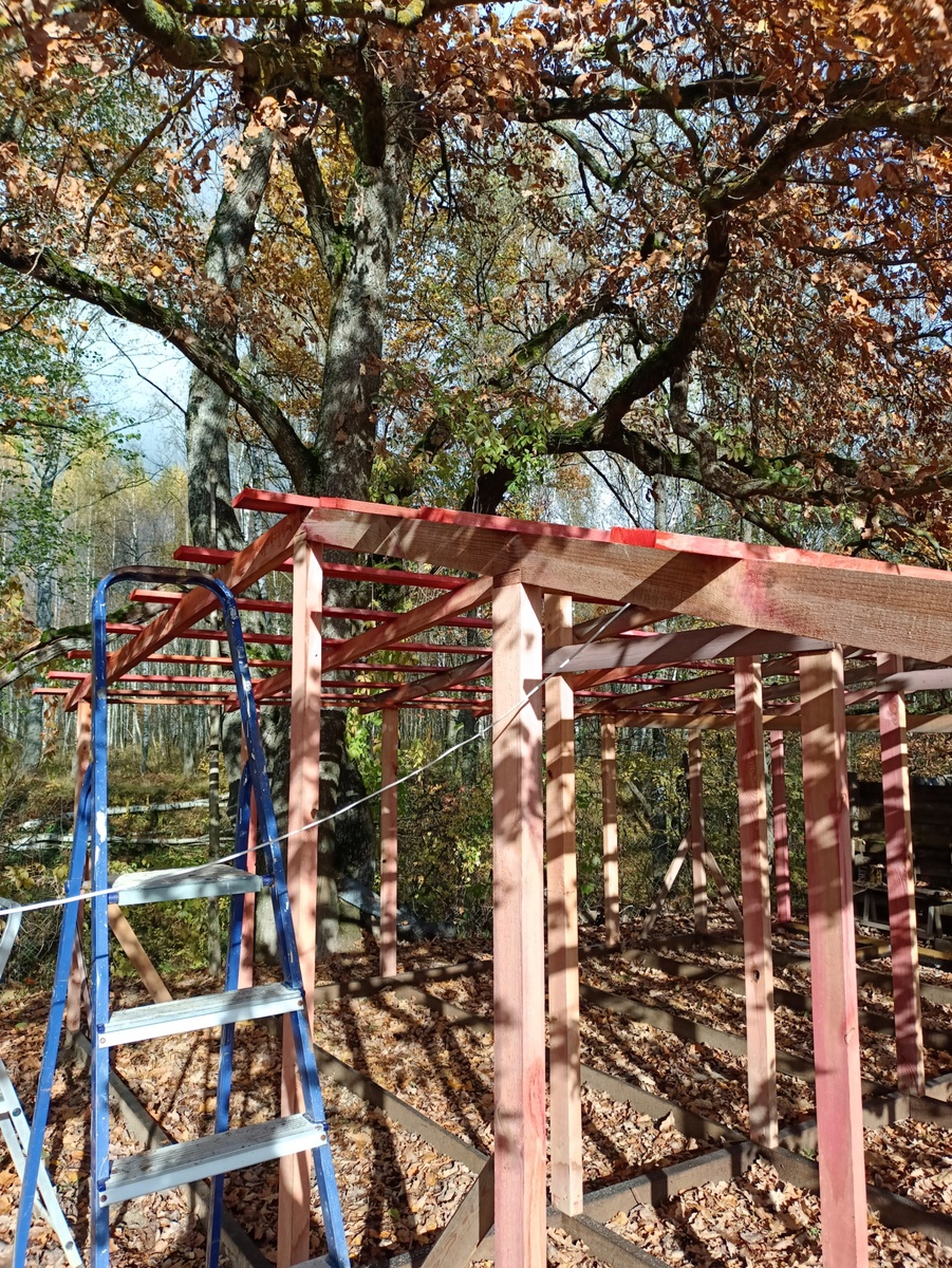 Сетевой инструмент не стал использовать. Аккумуляторным обойдёмся. При таком резком переключении дождь/солнце он безопаснее. Отмерил и срезал все излишки обрешётки. По 18см с обоих сторон. Все торцы сразу же покрыл антисептик-антипиреном.