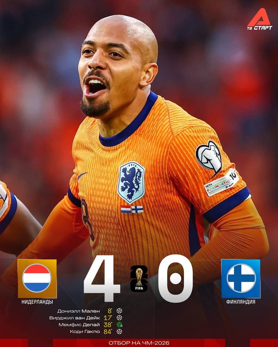 ✅👏 Голландцы все решили в первом тайме Уложили финнам три мяча до перерыва, отличились Мален, ван Дейк и Депай. В концовке точку поставил Гакпо – 4:0. До выхода на ЧМ остался один шаг 👣 Подписывайся на ТВ СТАРТ в MAX📲