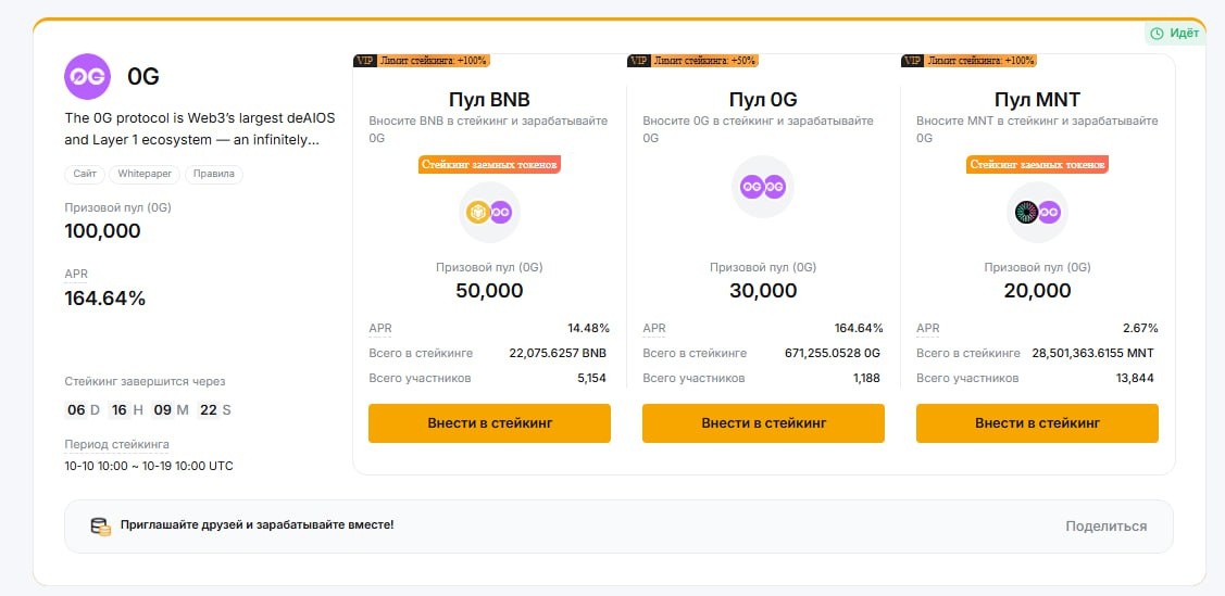 📈 BYBIT БЕСПЛАТНО РАЗДАЕТ ДЕНЬГИ В LAUNCHPOOL 0G 💰 ✨ Зарабатываем токен $0G за стейкинг BNB, 0G или MNT. ✅ Как участвовать: 1️⃣ Регистрируемся на бирже Bybit 2️⃣ Проходим KYC (верификацию 1 уровня) 3️⃣ Переходим в раздел Launchpool 4️⃣ Выбираем пул (BNB, 0G или MNT) 5️⃣ Вносим выбранные монеты 💵 Каждый день получаем награду в виде монет $0G. Эти монеты можно сразу продать. 🗣 Пул BNB: мин 0.08 BNB — макс 12 BNB 🗣 Пул 0G: мин 40 0G — макс 2 000 0G 🗣 Пул MNT: мин 60 MNT — макс 10 000 MNT Я буду участвовать через $MNT. Если у вас больше $BNB или $0G, то лучше через них 😊 Так же там можно взять взаем токены $BNB и $MNT и участвовать с ними 😂 ⌛ Период стейкинга до 19-10 10:00 UTC. 📈 Launchpool 0G на Bybit 📈 Регистрация на Bybit (все возможные бонусы и скидки)