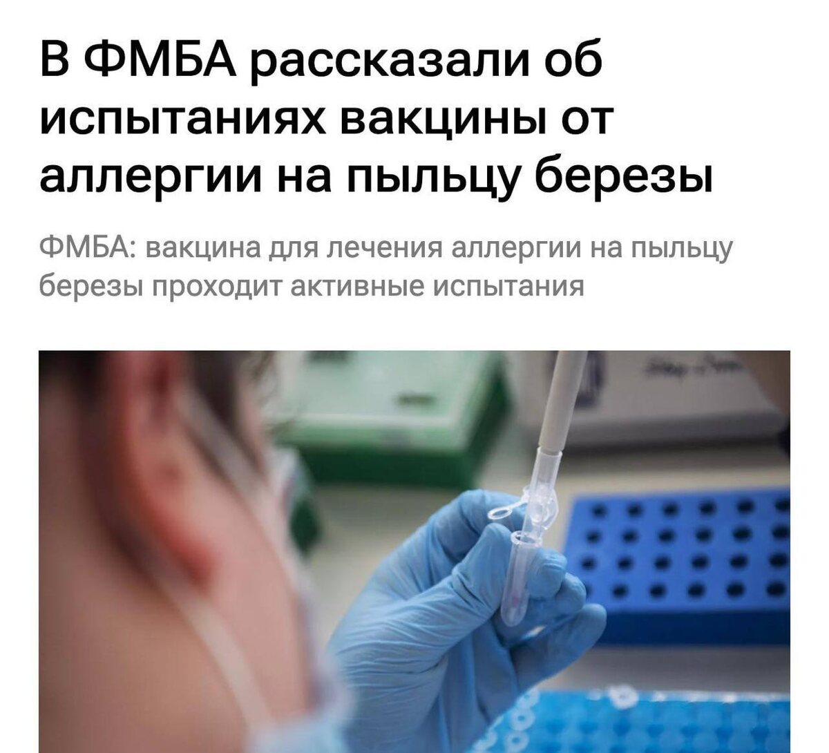 Минус слёзы, сопли и майская агония. Российские учёные сварили вакцину от аллергии на пыльцу берёзы и еду. Сейчас гоняют её на людях. Если всё пойдёт по плану — колоться сможет любой страдалец. Обещают минус чих, зуд и глаза как после трёхдневного запоя. Аллергия, давай, до свидания.