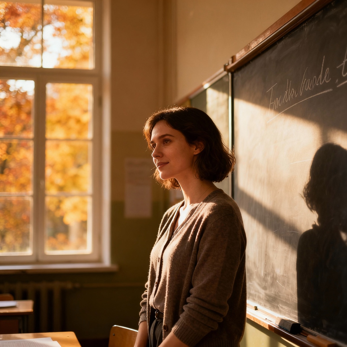 Анна вытирала мел с доски медленными, размеренными движениями. За окном начинался осенний дождь, и капли стекали по стеклу, оставляя извилистые дорожки. Последний ученик уже покинул класс десять минут назад, но она все еще оставалась здесь, наслаждаясь тишиной и покоем пустого кабинета. Здесь, среди детских рисунков на стенах и стопок тетрадей на столе, она чувствовала себя в безопасности.