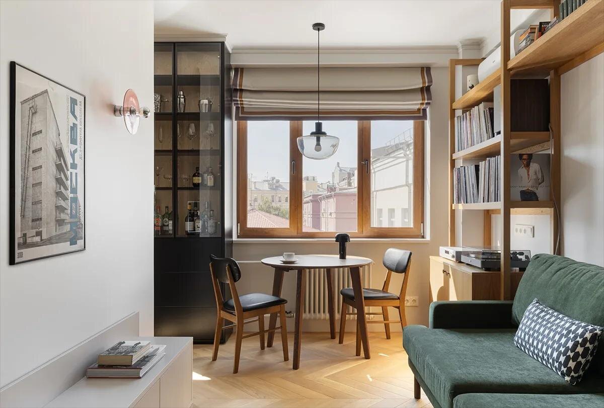 «В квартире была крошечная кухня и небольшая гостиная, в которой помещался диван, рабочее место и стеллаж для книг. Потребность в рабочем месте со временем отпала. Оказалось, что с ноутбуком удобнее сидеть за обеденным столом на кухне. За этим же столом на маленькой кухне приходилось принимать гостей. А хозяин любит собирать у себя друзей и мечтал об удобном столике в гостиной», — рассказывают в студии DSGN HUB, которая помогла владельцу квартиры сделать ремонт в нужном ему стиле.