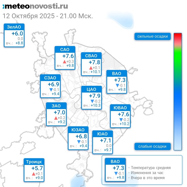 В 21:00 в Москве было от +5.6°C до +8°C, средняя температура +7.2°C #погода #Москва #осень #температура #12октября #воскресенье