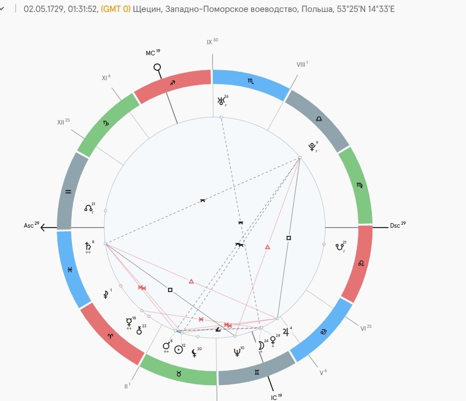 Для начала обратимся к сердцевине личности самой императрицы. Данные её рождения можно найти в международном Астробанке. Благо щепетильные немцы фиксировали время рождения знантных отпрысков. Астрология в Европе в те времена имела свою популярность и несла прогрессивную роль. Итак, данные рождения Екатерины Великой 2 мая 1729 г, 01:31:52 Щецин , Польша 53’25 N 14’33 E Её тельцовая ♉️, земная натура была наделена смелостью и волевой инициативой – ☀️ в соединении с Марсом ♂ рождает сильнейшую целеустремленность. Мощный Сатурн 🪐 , символизирующий управление, вознёс её на престол. Эта планета наделила Екатерину способностью стойко выдерживать груз ответственности великой правительницы и проявлять высочайшую самодисциплину в критических ситуациях. Великодушный Юпитер в её натальной карте проявлялся в широте взглядов, щедрости, тяге к просвещению и одержимой целеустремленности. От природы государыня была царственна 👑 и прекрасно осознавала собственную ценность. Теперь перейдём к нашим с