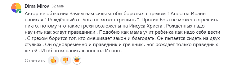Дима Миров, благодарю за важный комментарий. Вы подняли ключевой вопрос, требующий внимательного изучения Библии, а не отдельных стихов. Вы правы, цитируя 1 Иоанна 3:9: «Рожденный от Бога не делает греха, потому что рожден от Бога». Это обетование и цель Божьего искупления!