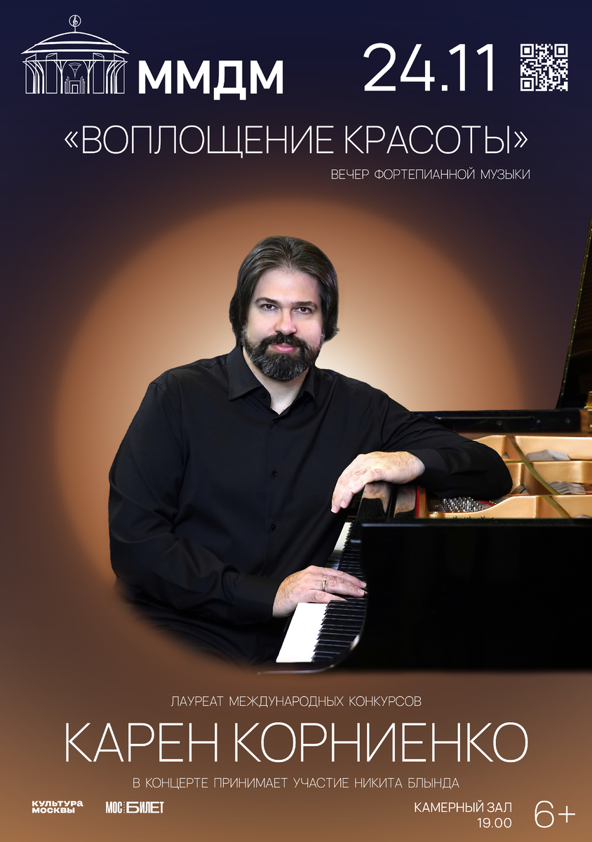 Дорогие друзья! 24 ноября планируется мой концерт в Камерном зале Московского Международного Дома Музыки с интересной программой "Воплощение красоты"! Только что появилась афиша на сайте ММДМ и открылась продажа билетов! Билеты можно приобрести по этой ссылке или в кассе ММДМ: Билеты также можно приобрести на многих популярных сервисах по продаже билетов: Зал очень хороший, удобный с отличным роялем и акустикой! Играл в нём много раз, очень он мне нравится! Полная программа концерта «Воплощение красоты»: Купить билет от 800 Вечер фортепианной музыки Карен КОРНИЕНКО, фортепиано В концерте принимает участие Никита БЛЫНДА, фортепиано В программе: 1 отделение К.В. Глюк – Д. Сгамбатти.«Мелодия» из оперы «Орфей» И.С. Бах – М. Хесс.Хорал из кантаты № 147 «Jesu, Joy of Man's Desiring»В.А. Моцарт.Рондо ре мажор, К. 485 Л. ван Бетховен.«К Элизе» Р. Шуман.Арабеска, ор. 18 Ф. Шуберт.Музыкальный момент фа минор Экспромт соль-бемоль мажор, ор. 90 № 3 Ф. Шуберт – Ф.Лист.Серенада Ф. Шуберт – Ф. Лис