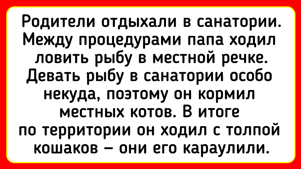Родители отдыхали в санатории. Между процедурами папа ходил ловить рыбу в местной речке. Девать рыбу в санатории особо некуда, поэтому он кормил местных котов. В итоге по территории он ходил с толпой кошаков — они его караулили. © Ольга Песец / ADME