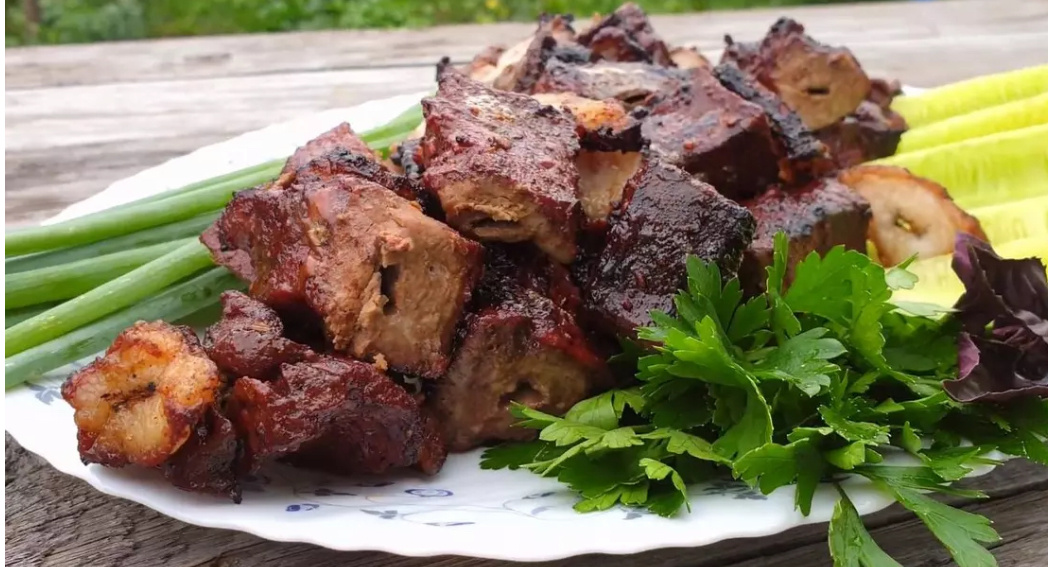 Шашлык из говяжьей печени с курдюком — блюдо узбекской кухни, которое готовится на мангале или в духовке. Курдюк (думба) быстро отдаёт свой вкус печени, и шашлык получается нежным. Печень относят к субпродуктам первой категории. Она обладает приятным вкусом и мягкой консистенцией, но быстро становится жесткой при неправильной тепловой обработке. Французы предпочитают готовить из печени паштеты, итальянцы тушат в соусе на основе вина или коньяка, китайцы комбинируют с грибами сянгу (шиитаке). В Центральной Азии и на Кавказе печень часто готовят на шампурах на углях. Чтобы в процессе жарки она не утратила сочность, куски комбинируют с ломтиками курдючного сала. Шашлык из говяжьей печени на мангале рецепт. Сегодня мы приготовим вкусные и сочные шашлычки из говяжей печени. В таком виде печенку полюбит даже тот, кто в обычной жизни её не любит. Это и ярко и сочно и нежно и очень вкусно и самое главное мягко! Шашлык из печени на мангале готовят за считанные минуты. Он обладает характерным п