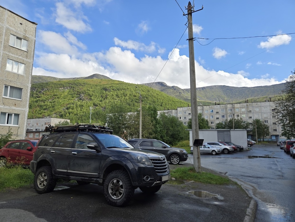 Пообедав, сели в Ховер и сквозь дождь выехали из Кировска. Рядом с городом находится озеро Большой Вудъявр, и мы проехали мимо него (хотя в дождь сложно было насладиться его красотами). Асфальт под колёсами сменился на грейдер, и мы добрались до озера Малый Вудъявр, окружённого горами. Съехали с грейдера на каменистую грунтовку (N67.668545, E33.643912) и сразу же переехали вброд два небольших ручейка (перед этим я остановился и предусмотрительно замкнул колёсные хабы - что всегда следует делать заранее перед въездом в горы). За окном была хмурая и дождливая погода, мокрая каменистая грунтовая дорога - и возвышающиеся впереди горы, на которых белели не растаявшие даже к августу снежники. Впервые за всё путешествие у меня где-то в животе возник холодок от предчувствия внедорожных приключений.