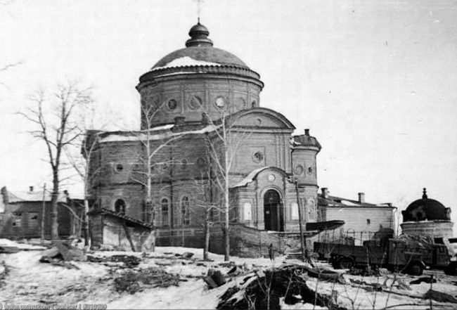 Фотография, примерно ноябрь 1942 года, во время фашистской оккупации, Знаменский монастырь. Церковь Воскресения Христова. За время оккупации две тысячи курян немцы расстреляли в Щетинке, десять угнали в в Германию, еще столько же умерло от эпидемий и голода, не считая советских военнопленных в лагерях рядом с Курском. Немцы, уходя из Курска, сожгли или взорвали все большие дома. Здания мединститута и пединститута, собор, цирк, дом офицеров, все школы города, все многоэтажные жилые дома, театр. Фото 1