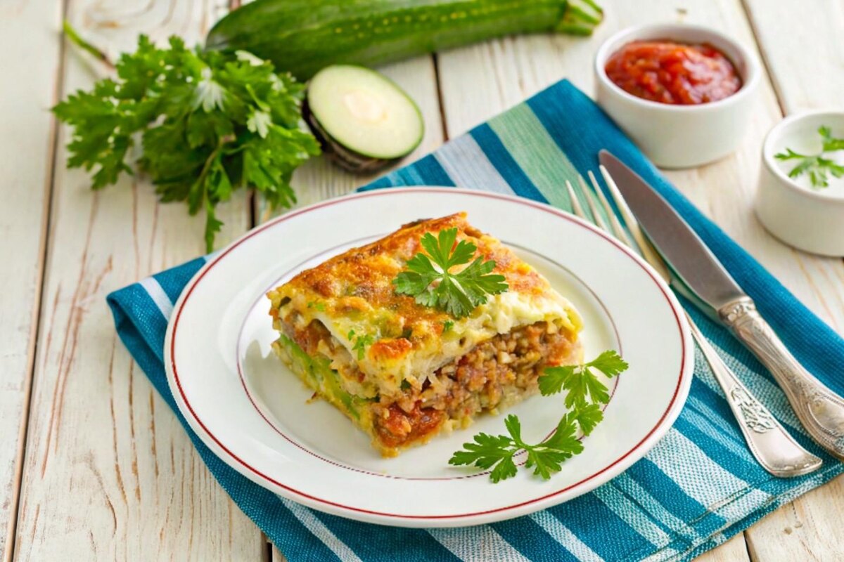 Подготовьте все ингредиенты. Кабачки и лук очистите и ополосните. Фарш берите любой. У меня курино-говяжий. Я хотела получить более диетический вариант, поэтому взяла фарш из отваренного предварительно мяса и прокрутила его на мясорубке. Нарежьте лук средним кубиком. Вы можете взять сырой фарш и, когда будете обжаривать на сковороде лук, обжарьте и мясо.