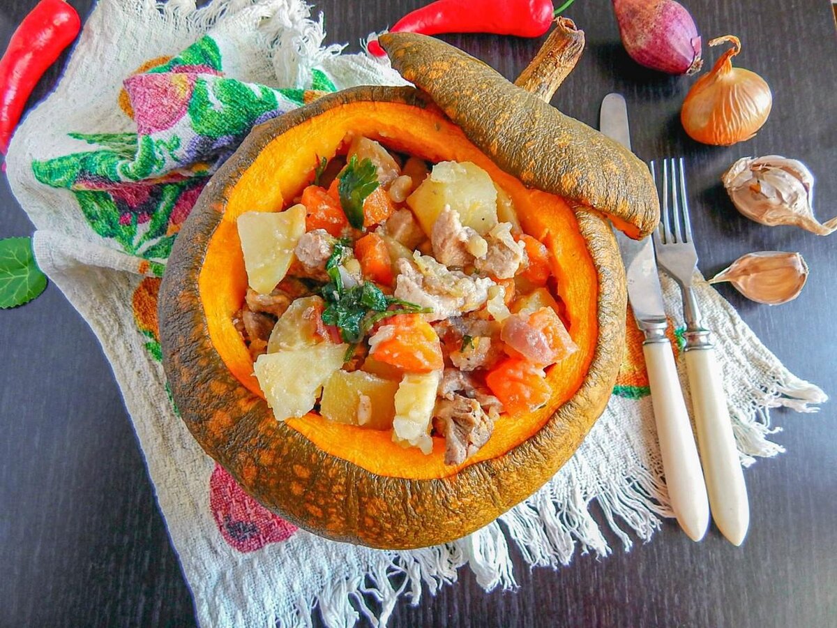 Выньте ложкой мякоть с семечками. Еще раз вымойте тыкву внутри. Верхушку не выкидывайте, она будет служить крышкой во время запекания, чтобы мясо и овощи томились в собственном соку. Включите духовку на 180 градусов.