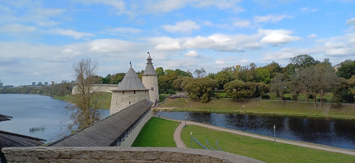 Псков, расположенный на северо-западных рубежах нашей родины, за свою более чем тысячелетнюю историю нередко подвергался атакам иноземных войск: в XIII-XVIII веках он прошёл через 126 войн!!! Неспокойная жизнь на границе государства российского научила псковитян защищать себя. Для этого в разные годы существования города они возвели пять колец крепостных стен вокруг ядра города - Кремля или Крома - протяжённость которых была около 10 километров!!!