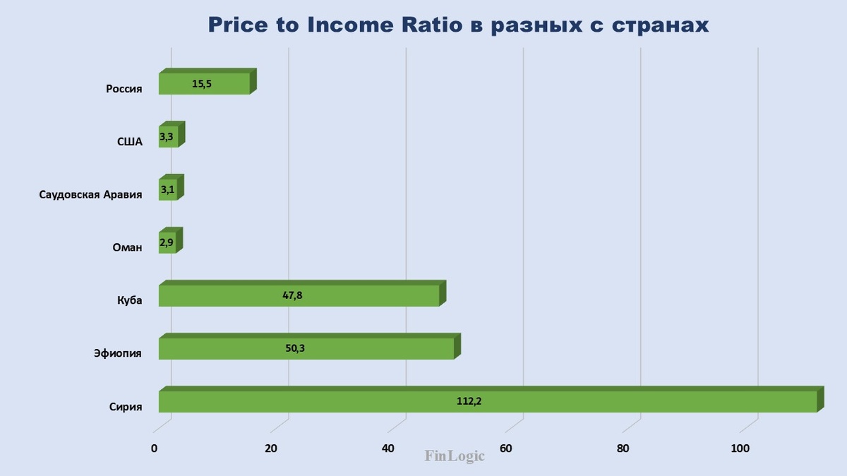 Чтобы понять, насколько недвижимость доступна в разных странах, экономисты используют показатель Price to Income Ratio (средняя стоимость жилья/средний годовой доход семей). Он показывает, сколько лет среднестатистической семье в конкретной стране нужно копить, чтобы купить жилье, не тратясь ни на что другое. То есть чем меньше, тем лучше. 📈Топ-3 страны с самым высоким показателем Price to Income Ratio, то есть с самым труднодоступным жильём (все цены далее за м² в новостройках): 1️⃣Сирия — 112,2. Средняя цена за м² — 800$ Парадокс Сирии объясняется не высокими ценами, а катастрофически низкими доходами населения на фоне разрушенной экономики. 2️⃣Эфиопия — 50,3. Не удалось найти актуальных данных. 3️⃣Куба — 47,8. Средняя цена за м² —1500$ 📉 Топ-3 страны с самым низким показателем Price to Income Ratio, с самым доступным жильём: 1️⃣Оман — 2,9. Средняя цена м² —1500$ 2️⃣Саудовская Аравия — 3,1. Средняя цена за м² —1320$ 3️⃣США — 3,3. Средняя цена за м² в новостройках —3500$ В