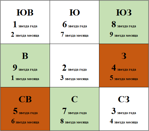 ⭐️ СЕВЕРО-ЗАПАД Звезда года – 3 Звезда месяца – 4 Сектор хороший для обучения и заработка с применением знаний. Так же сектор подходит для поиска партнера и несет хорошие романтические перспективы. Но возможна расточительность, контролируйте финансы. Корректор: свечи. ⭐️ ЗАПАД. Звезда года – 4 Звезда месяца – 5 Для здоровья, общего самочувствия неблагоприятный сектор. Недопустим азарт, может привести к потере благосостояния. Конфликты. Сектор в этом месяце лучше избегать, не делать ремонт. Корректор: поющая чаша, комнатные растения. ⭐️ СЕВЕРО-ВОСТОК Звезда года –5 Звезда месяца – 6 Несмотря на то, что из-за годовой 5 сектор неблагоприятен – в этом месяце комбинация хороша для финансов и недвижимости, для работы и руководителей. Но несет проблемы со здоровьем, особенно у пожилых людей. Корректор: поющая чаша, металлические предметы. ⭐️ ЮГО-ЗАПАД. Звезда года – 8 Звезда месяца –9 Прекрасная комбинация, которая несет богатство и счастливые события. Праздники, карьерный рост, гармония в