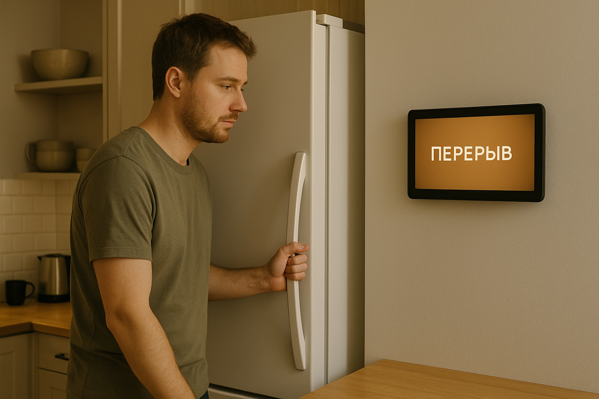 Утром пошёл на кухню, как обычно, открыть холодильник. Потянул за ручку — не поддаётся. Экран на двери загорелся и выдал короткое сообщение: «Перерыв. Попробуйте позже.» Сначала я подумал, что это шутка. Потом — что сломался замок. Но нет, всё работало: индикаторы горят, температура в норме, просто не открывается.