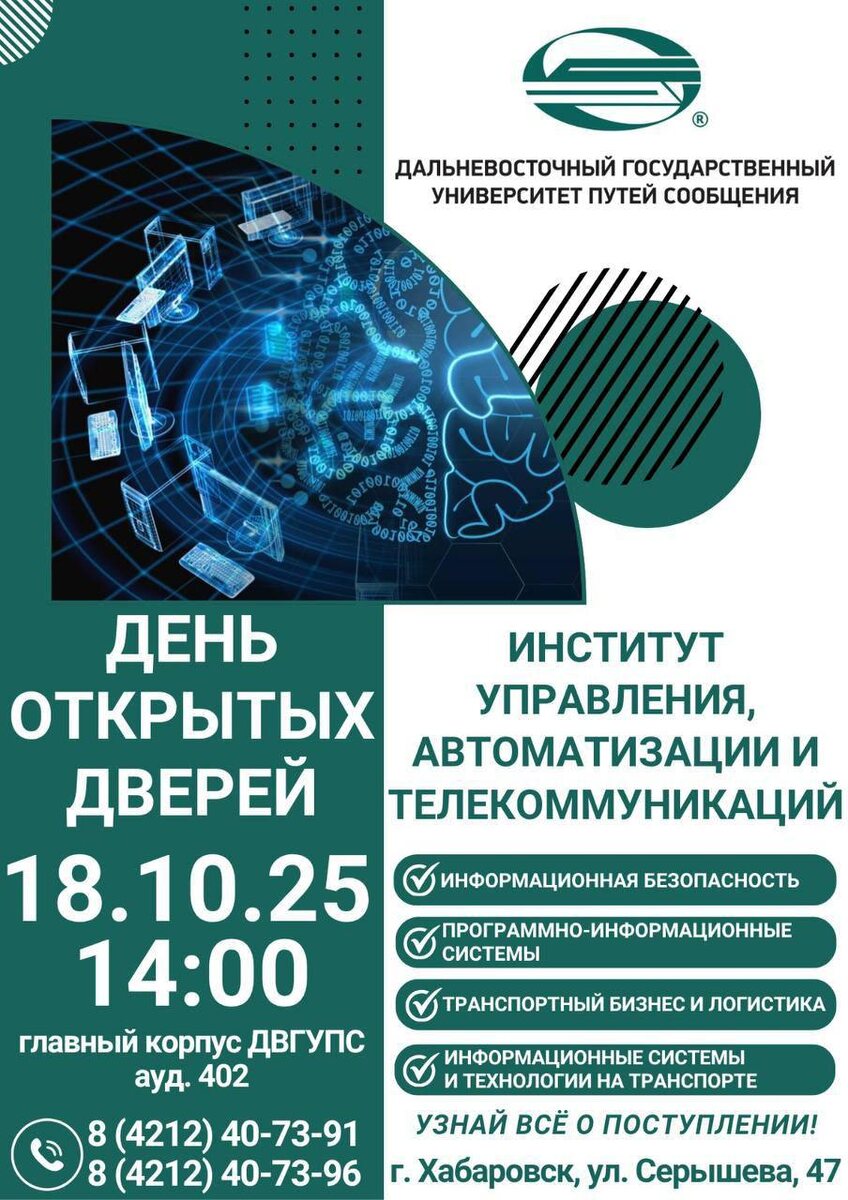 🔴Внимание, старт! Дни открытых дверей в ДВГУПС начинаются! ‼️‼️ ДВГУПС запускает серию дней открытых дверей, и мы начинаем с одного из самых современных и технологичных институтов. Института управления, автоматизации и телекоммуникаций (ИУАТ). 🟢Хотите познакомиться с директором и преподавателями института? 🟢Узнать о востребованных направлениях подготовки? 🟢Получить ответы на вопросы о поступлении? Все это и не только вы сможете узнать на дне открытых дверей. Готовьте свой список вопросов и приходите. 🫶Не упустите возможность лично познакомиться с ДВГУПС и институтом! 🚂 Выбирай правильно — выбирай ДВГУПС!
