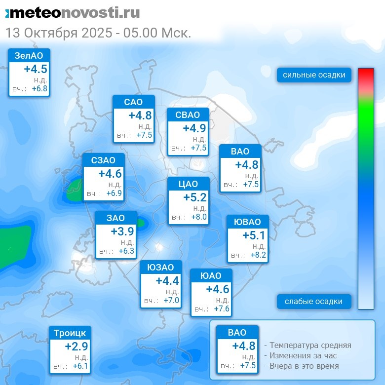 В 5:00 в Москве было от +3.3°C до +5.4°C, средняя температура +4.8°C #погода #Москва #осень #температура #13октября #понедельник