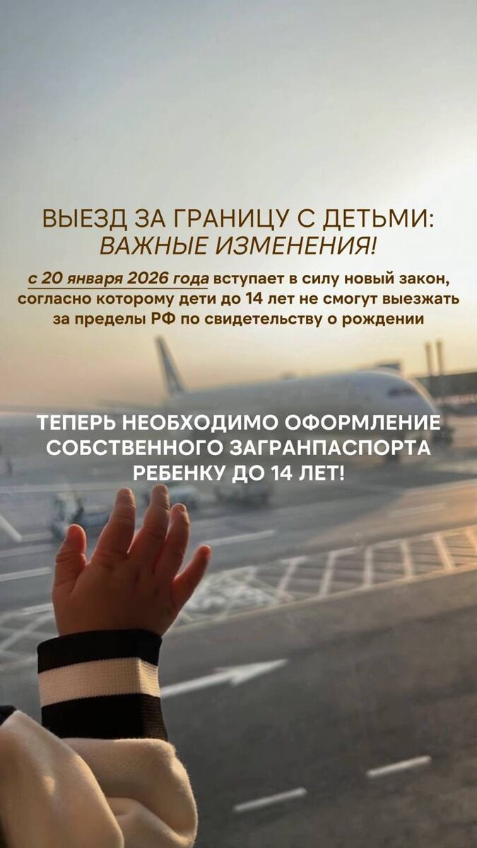 ВЫЕЗД ЗА ГРАНИЦУ С ДЕТЬМИ: Важные изменения С 20 января 2026 года вступает в силу новый закон, согласно которому дети до 14 лет не смогут выезжать за пределы РФ по свидетельству о рождении. ⚠️Теперь необходимо оформление собственного Загранпаспорта ребенку до 14 лет! О каких странах идет речь: Абхазия Армения Беларусь Казахстан Киргизия Южная Осетия В этих странах ранее не требовался загранпаспорт, достаточно было свидетельства о рождении с отметкой о гражданстве. ❗️Поэтому, всем путешественникам, планирующим отдых в этих странах зимой / весной - УЖЕ сейчас необходимо начинать процедуру оформления загран. паспорта своим детям, т.к. помним, что - срок его изготовления - составляет от 1 месяца 📍Подписывайтесь на канал АТЛАС чтобы раньше других знать больше остальных #новости #новоституризма #новостисатлас #атлас_новости #ПолезноОтАтлас #ПолезыеСоветы #Полезняшечки