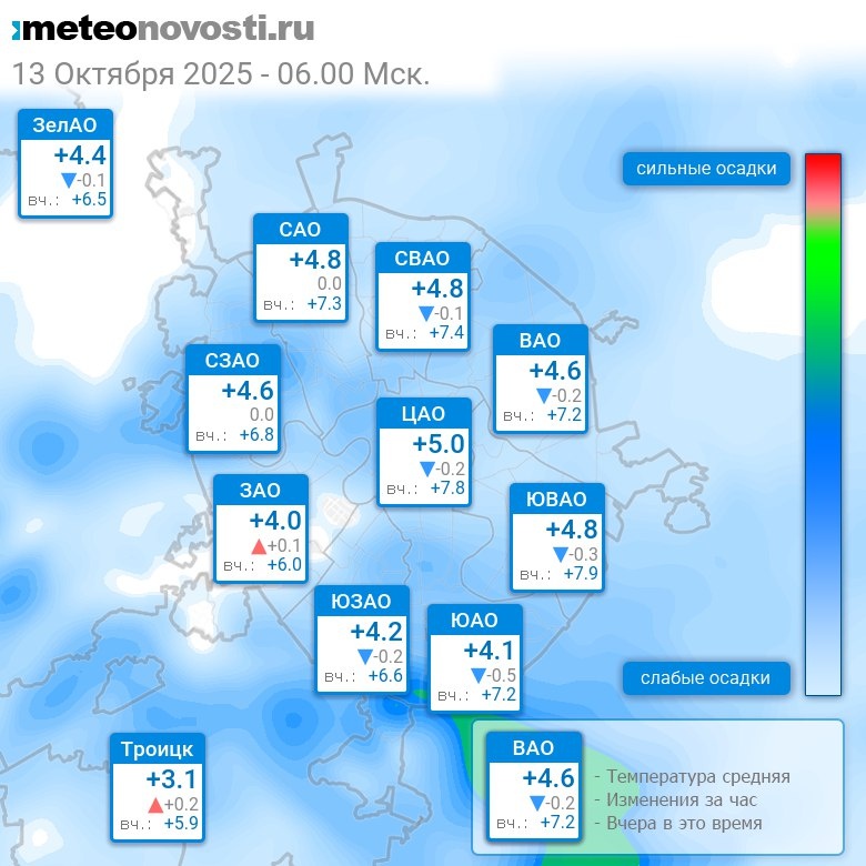 В 6:00 в Москве было от +3.3°C до +5.2°C, средняя температура +4.6°C #погода #Москва #осень #температура #13октября #понедельник Перейти на сайт Прогноз погоды на 14 дней