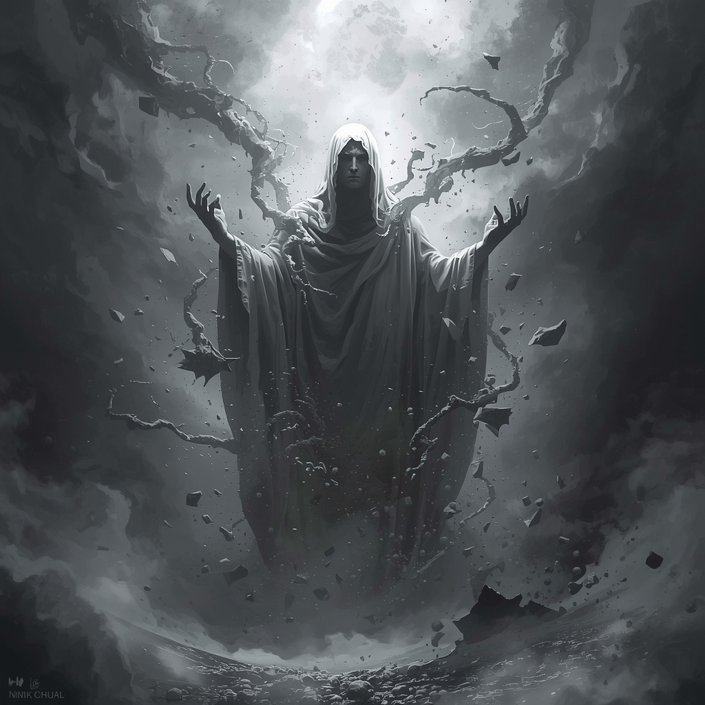 Вестник Небытия приближался медленно, и с каждым его шагом реальность вокруг становилась не просто менее определённой — она становилась более сомневающейся в собственном праве на существование. Это не был обычный житель Сердца Пустоты. Это было воплощение самого принципа отрицания, философия отчаяния, обретшая форму и волю.