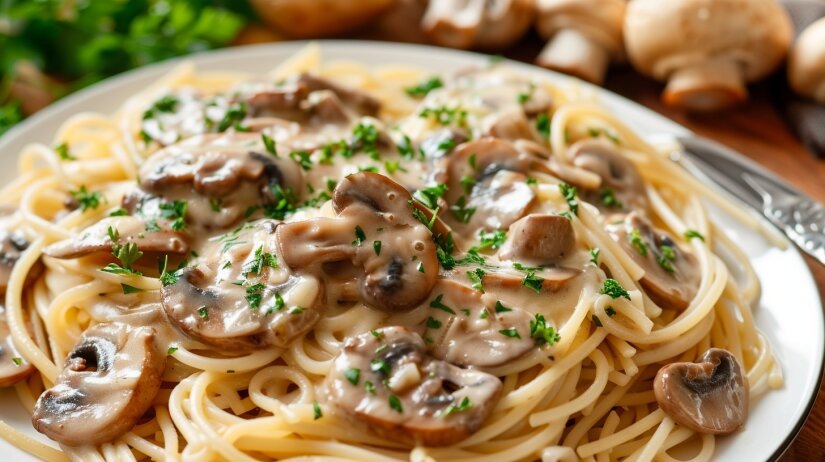 - Добавляем к грибам сливки и соевый соус, жарим 3-5 минут непрерывно помешивая, пока соус слегка не выпарится. В конце добавляем тертый чеснок и снова перемешиваем.