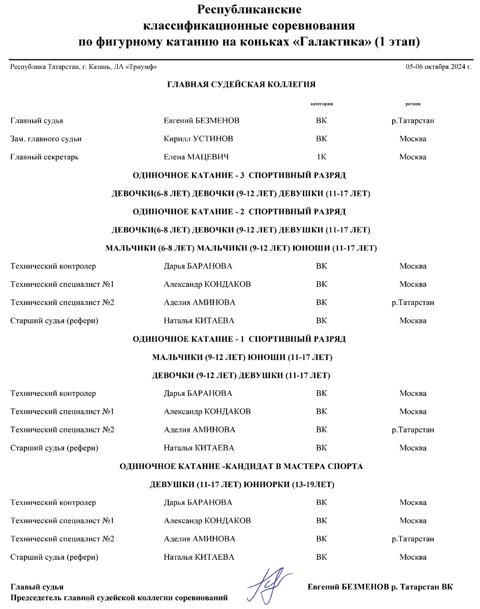 Продолжаем вспоминать, как выступали год назад представители ТШТ. 8. Республиканские классификационные соревнования по фигурному катанию на коньках "Галактика" (1 этап) (Казань, ЛА "Триумф", 5-6 октября 2024, главный судья Евгений Безменов). От ТШТ участвовали в женском одиночном по 1 спортивному разряду Анна Докукина и Илина Аскарова. Судейская коллегия: Женское одиночное, 1 спортивный разряд: 9. Кубок Снеж.Ком (1 этап) (Москва, ЛА "Снеж.Ком", 7-8 октября 2024, главный судья Александр Честных). От ТШТ участвовали: в женском одиночном по 2 спортивному разряду Юлия Матвеева, по 1 спортивному разряду София Шарипова; в мужском одиночном по 1 спортивному разряду Кирилл Жураховский и Максим Брагин. Судейская коллегия: Женское одиночное, 2 спортивный разряд: Женское одиночное, 1 спортивный разряд: Мужское одиночное, 1 спортивный разряд: 10. Турнир по фигурному катанию на коньках "Ледовые мечты" (Москва, ЛК "Южный лёд", 9-10 октября 2024, главный судья Кирилл Устинов). От ТШТ участвовали в же